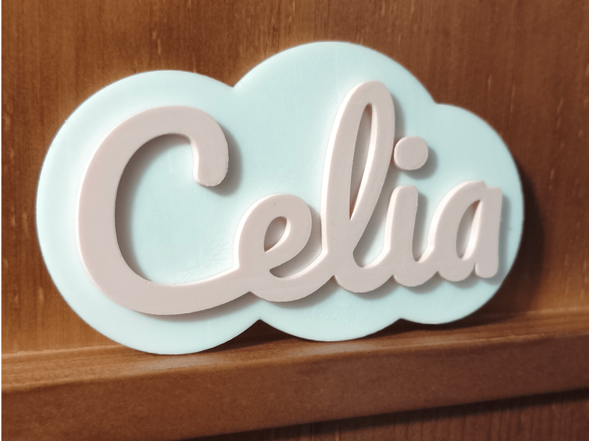 Acabado Bicolor: Base en blanco puro o crema para la nube, con el nombre resaltado en un color a contraste (como el rosa de la imagen, totalmente personalizable).